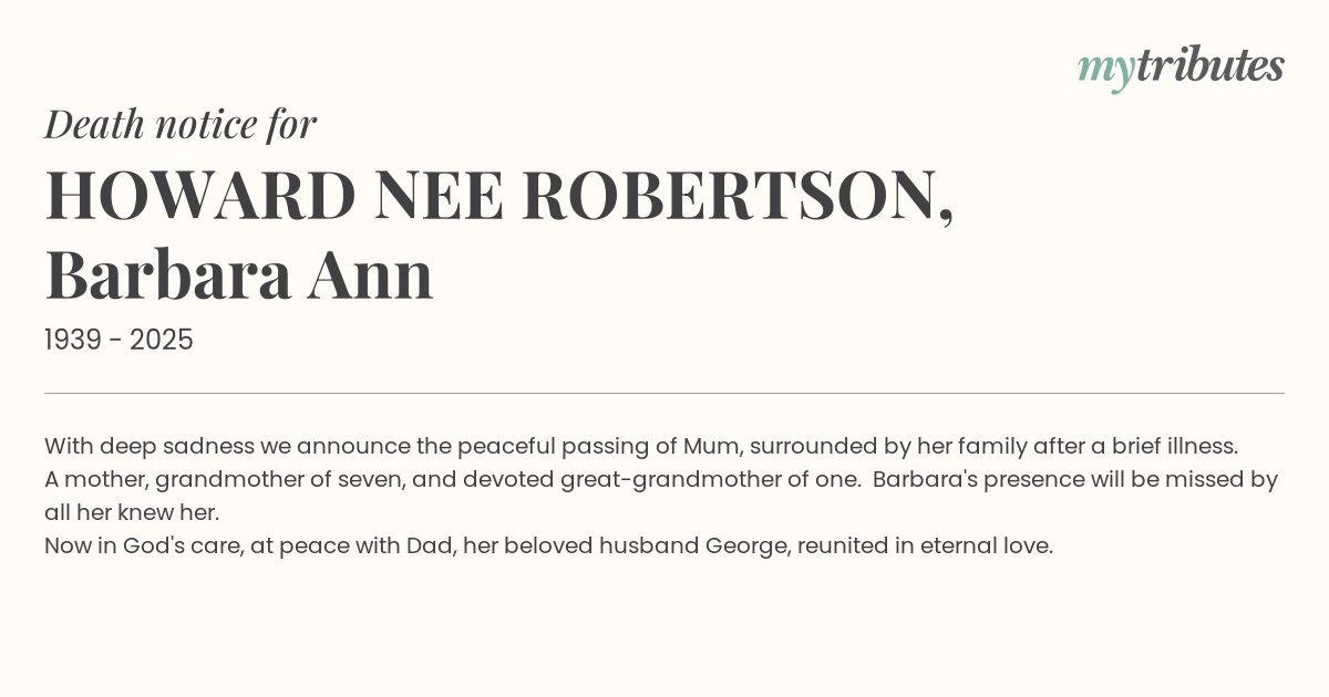 17°CWith deep sadness we announce the peaceful passing of Mum, surrounded by her family after a brief illness.