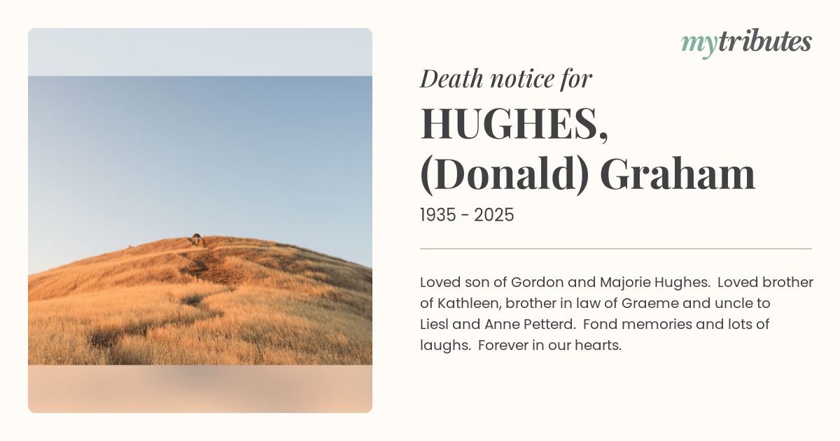 17°CLoved son of Gordon and Majorie Hughes. Loved brother of Kathleen, brother in law of Graeme and uncle to Liesl and Anne Petterd. Fond memories and lots of laughs. Forever in our hearts.