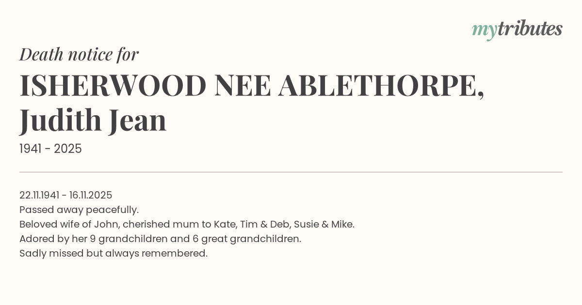 Beloved wife of John, cherished mum to Kate, Tim & Deb, Susie & Mike.