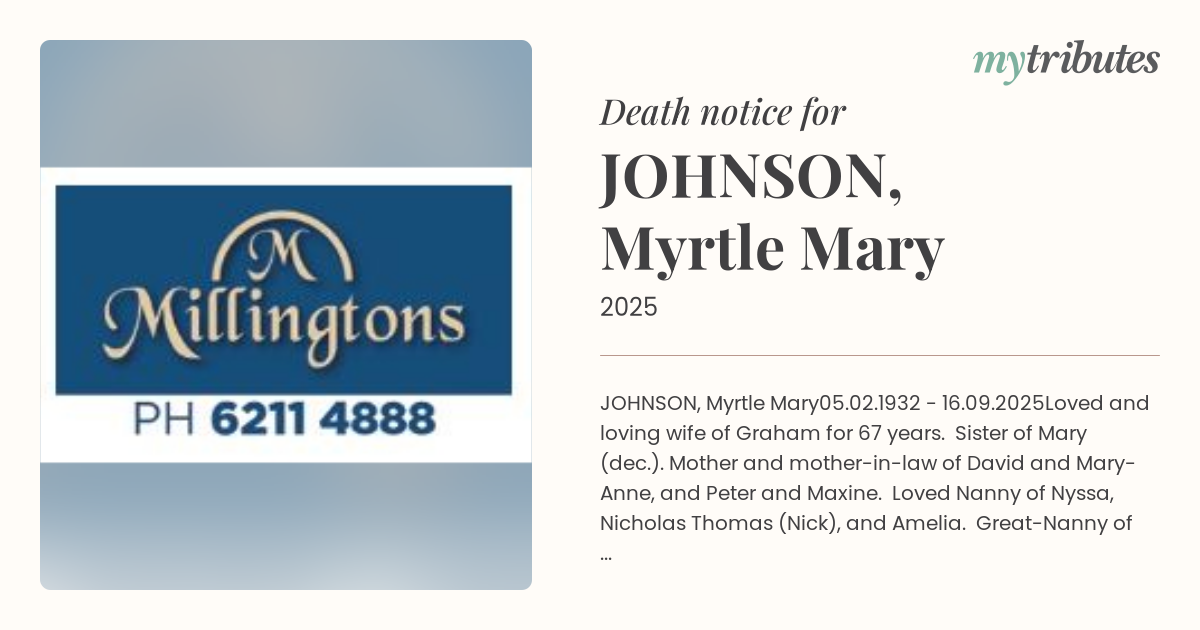 Loved and loving wife of Graham for 67 years. Sister of Mary (dec.). Mother and mother-in-law of David and Mary-Anne, and Peter and Maxine. Loved Nanny of Nyssa, Nicholas Thomas (Nick), and Amelia. Great-Nanny of Isobel.