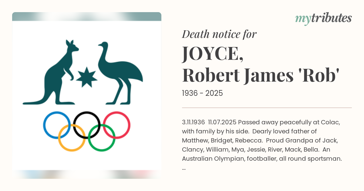 17°C3.11.1936 – 11.07.2025 Passed away peacefully at Colac, with family by his side. Dearly loved father of Matthew, Bridget, Rebecca. Proud Grandpa of Jack, Clancy, William, Mya, Jessie, River, Mack, Bella. An Australian Olympian, footballer, all round sportsman. A life well lived. Once an Olympian, always an Olympian. A private burial was held at the Woorndoo Cemetery. A Memorial Service will be held in Spring, date to be advised.
