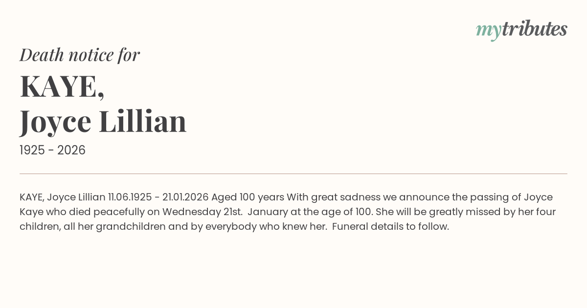 17°CKAYE, Joyce Lillian 11.06.1925 - 21.01.2026 Aged 100 years With great sadness we announce the passing of Joyce Kaye who died peacefully on Wednesday 21st. January at the age of 100. She will be greatly missed by her four children, all her grandchildren and by everybody who knew her.