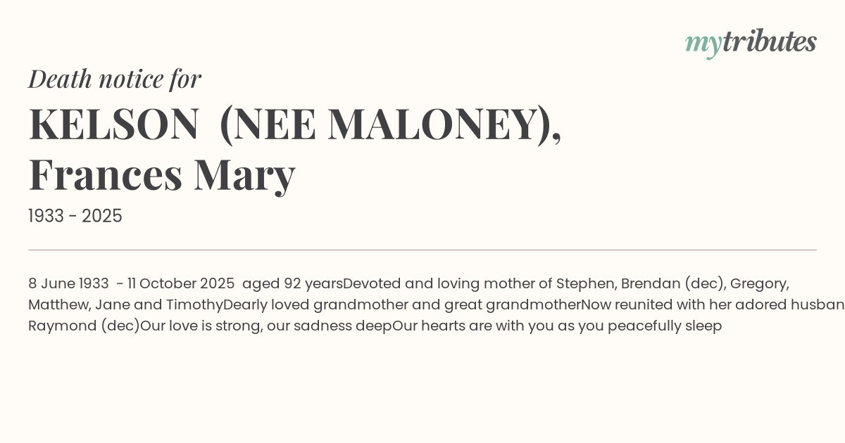Devoted and loving mother of Stephen, Brendan (dec), Gregory, Matthew, Jane and Timothy