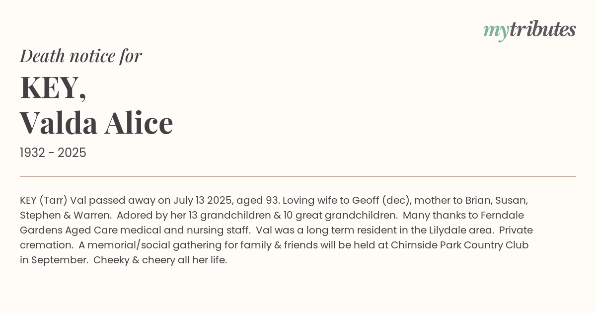 17°CKEY (Tarr) Val passed away on July 13 2025, aged 93. Loving wife to Geoff (dec), mother to Brian, Susan, Stephen & Warren. Adored by her 13 grandchildren & 10 great grandchildren. Many thanks to Ferndale Gardens Aged Care medical and nursing staff. Val was a long term resident in the Lilydale area. Private cremation. A memorial/social gathering for family & friends will be held at Chirnside Park Country Club in September. Cheeky & cheery all her life.