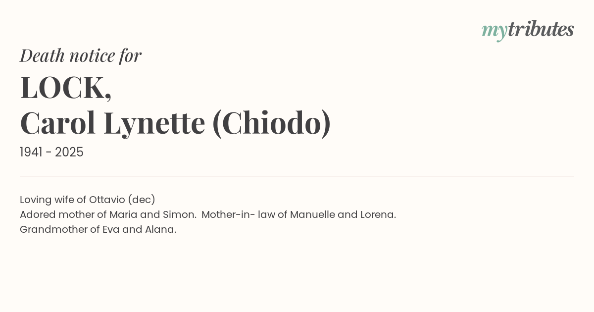 17°CLoving wife of Ottavio (dec) Adored mother of Maria and Simon. Mother-in- law of Manuelle and Lorena. Grandmother of Eva and Alana.