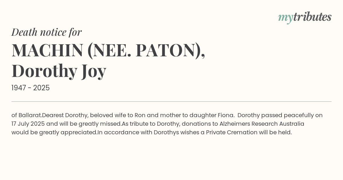 Dearest Dorothy, beloved wife to Ron and mother to daughter Fiona. Dorothy passed peacefully on 17 July 2025 and will be greatly missed.