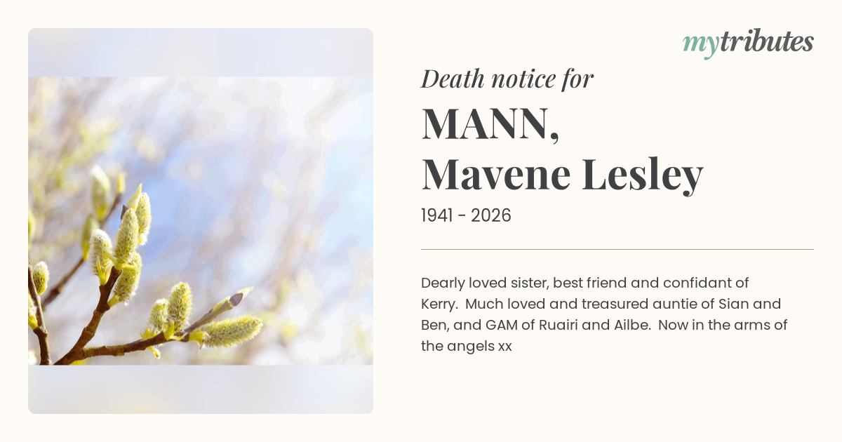 17°CDearly loved sister, best friend and confidant of Kerry. Much loved and treasured auntie of Sian and Ben, and GAM of Ruairi and Ailbe. Now in the arms of the angels xx