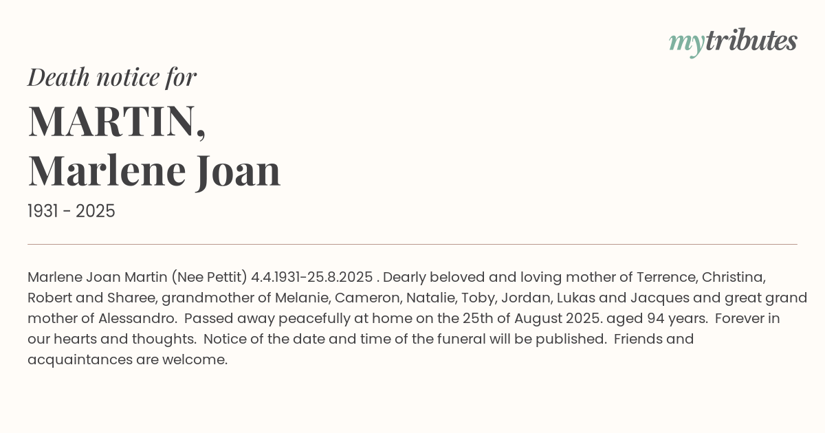 17°CMarlene Joan Martin (Nee Pettit) 4.4.1931-25.8.2025 . Dearly beloved and loving mother of Terrence, Christina, Robert and Sharee, grandmother of Melanie, Cameron, Natalie, Toby, Jordan, Lukas and Jacques and great grand mother of Alessandro. Passed away peacefully at home on the 25th of August 2025. aged 94 years. Forever in our hearts and thoughts. Notice of the date and time of the funeral will be published. Friends and acquaintances are welcome.