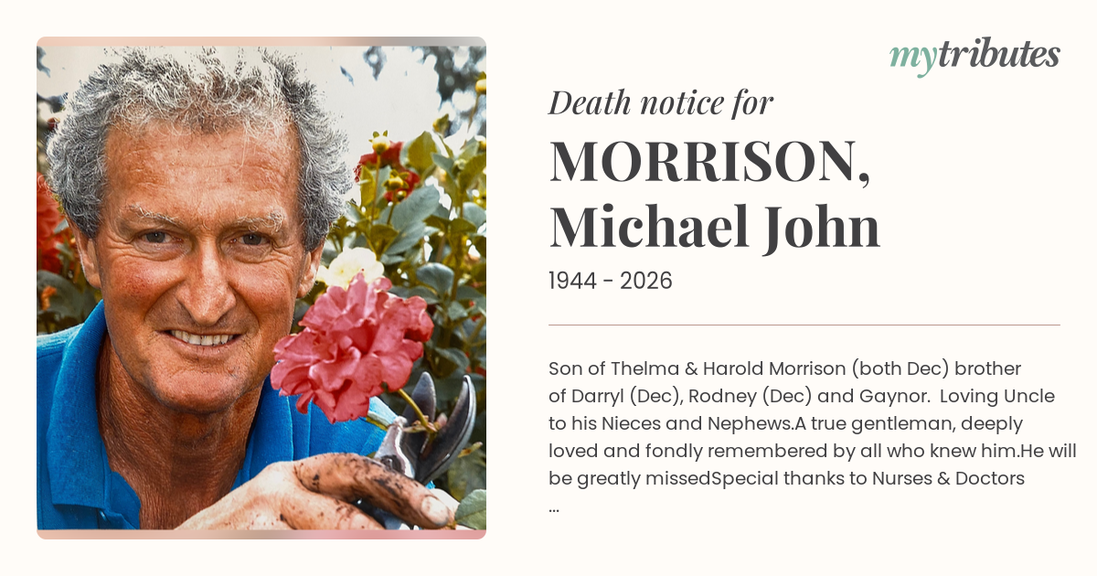 17°CSon of Thelma & Harold Morrison (both Dec) brother of Darryl (Dec), Rodney (Dec) and Gaynor. Loving Uncle to his Nieces and Nephews.