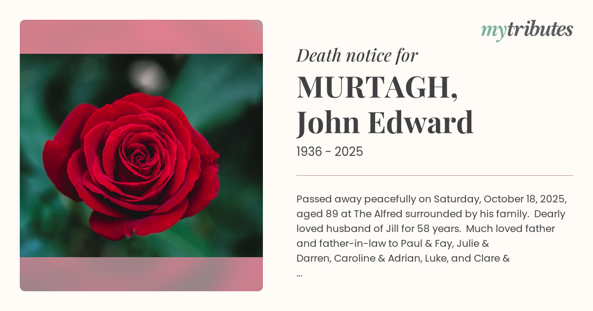 17°CPassed away peacefully on Saturday, October 18, 2025, aged 89 at The Alfred surrounded by his family. Dearly loved husband of Jill for 58 years. Much loved father and father-in-law to Paul & Fay, Julie & Darren, Caroline & Adrian, Luke, and Clare & Hayden. Adored grandfather of Adrian & Anna, Harrison & Emma, Alexandra, Lachlan, Christopher, Stephanie, Isabella, Madeleine, Grace and Elizabeth. Great-grandfather of Noa.