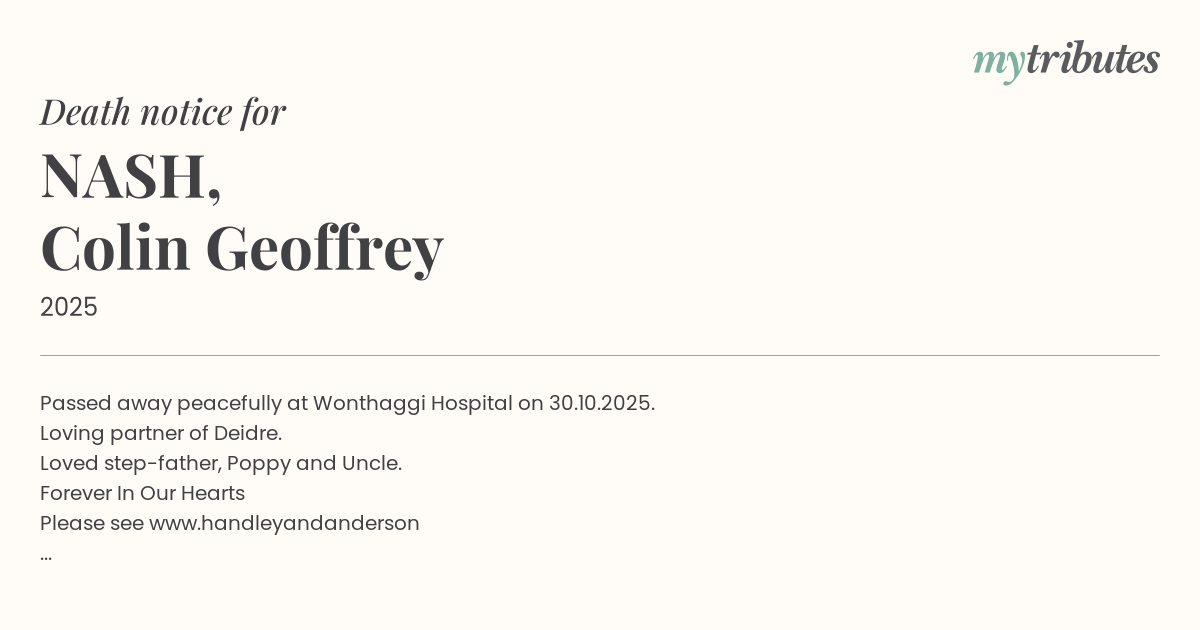 17°CPassed away peacefully at Wonthaggi Hospital on 30.10.2025.