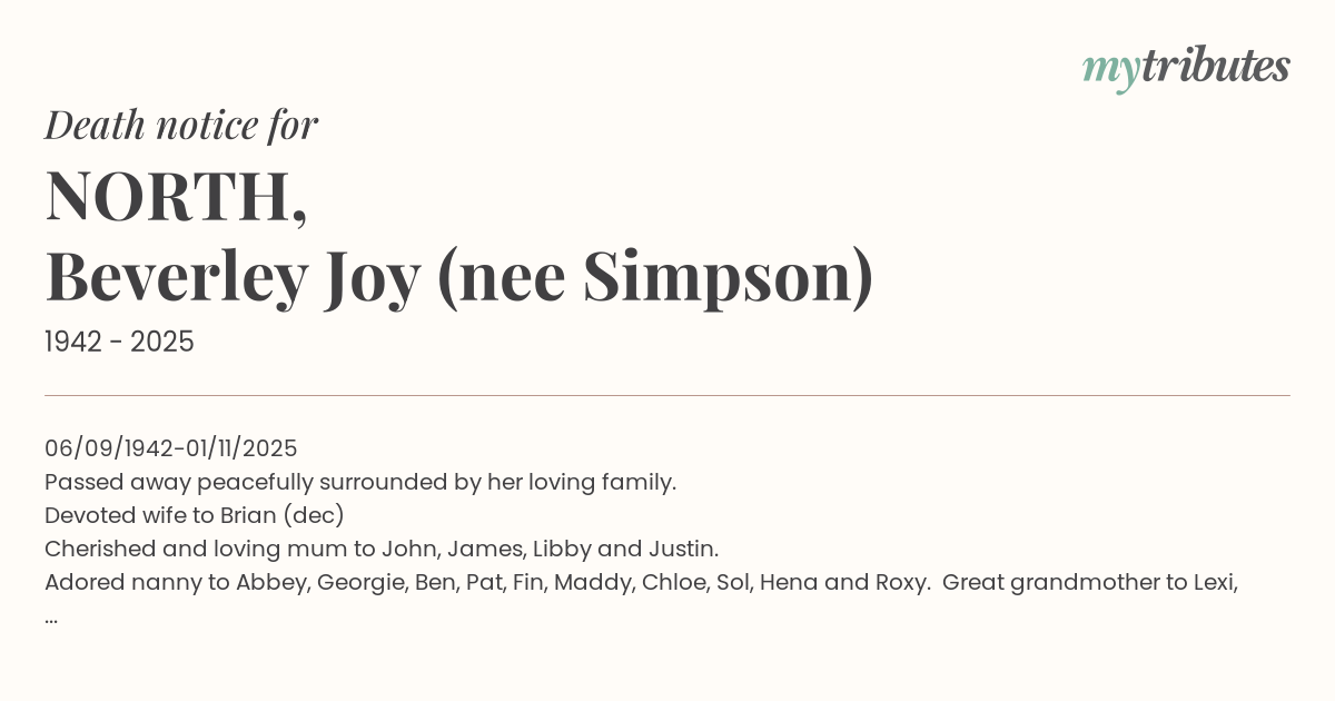 Cherished and loving mum to John, James, Libby and Justin. Adored nanny to Abbey, Georgie, Ben, Pat, Fin, Maddy, Chloe, Sol, Hena and Roxy. Great grandmother to Lexi, Leo, Levi, Bowie and Amira.