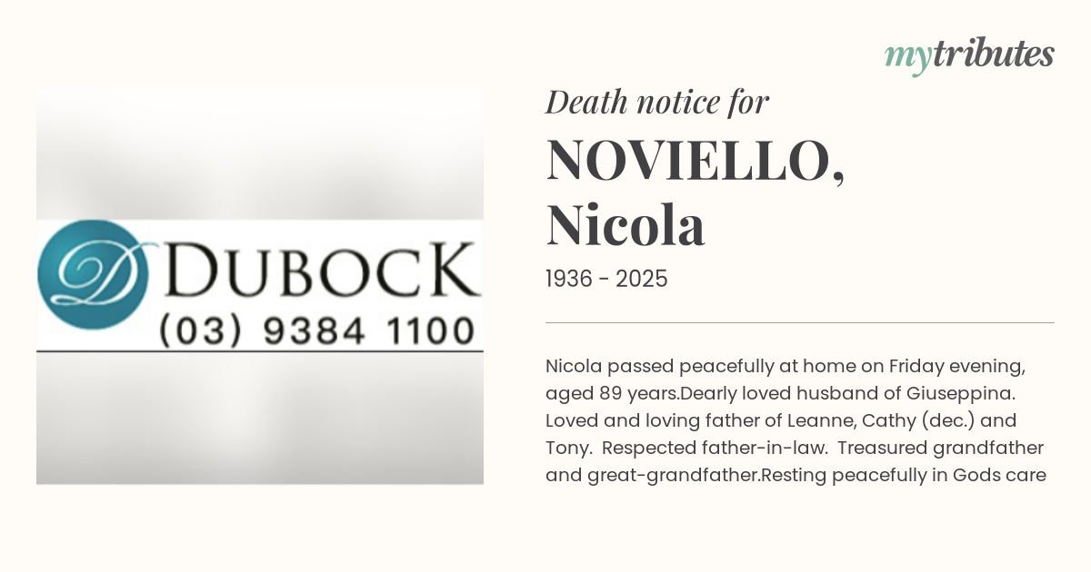 Dearly loved husband of Giuseppina. Loved and loving father of Leanne, Cathy (dec.) and Tony. Respected father-in-law. Treasured grandfather and great-grandfather.