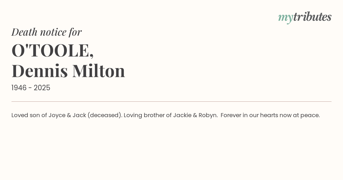 17°CLoved son of Joyce & Jack (deceased). Loving brother of Jackie & Robyn. Forever in our hearts now at peace.