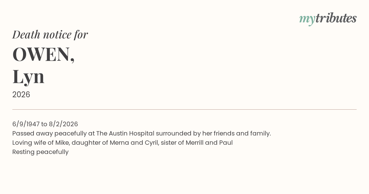 Passed away peacefully at The Austin Hospital surrounded by her friends and family.
