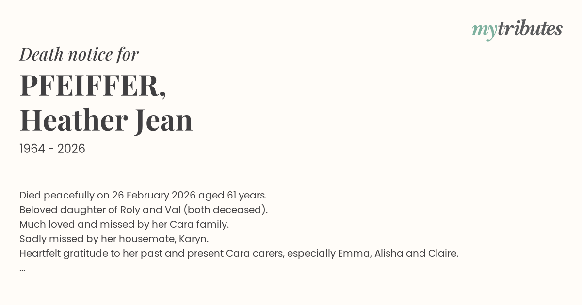 17°CDied peacefully on 26 February 2026 aged 61 years.