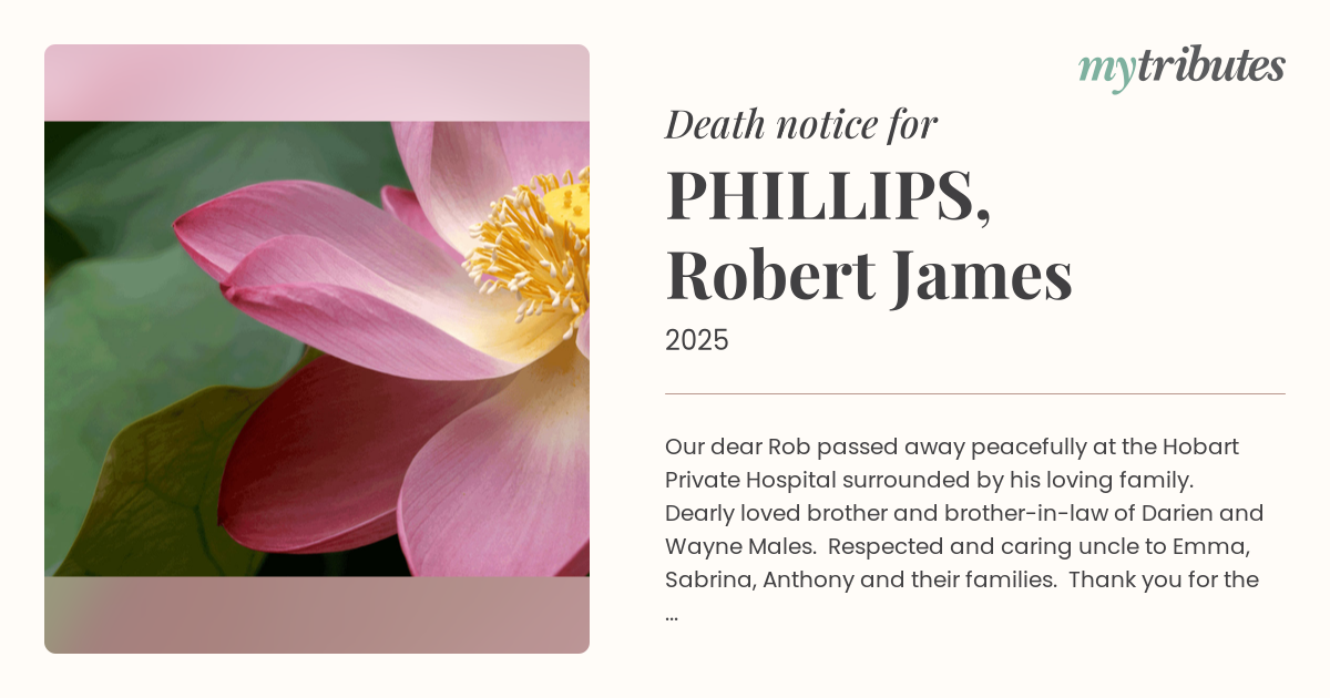 17°COur dear Rob passed away peacefully at the Hobart Private Hospital surrounded by his loving family. Dearly loved brother and brother-in-law of Darien and Wayne Males. Respected and caring uncle to Emma, Sabrina, Anthony and their families. Thank you for the care given to Rob by the wonderful staff at the HPH especially to Polly for whom we will be eternally grateful.
