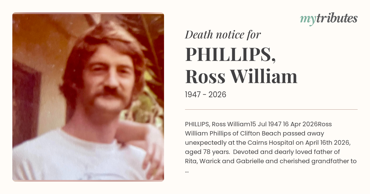 Ross William Phillips of Clifton Beach passed away unexpectedly at the Cairns Hospital on April 16th 2026, aged 78 years. Devoted and dearly loved father of Rita, Warick and Gabrielle and cherished grandfather to Bailey, Lillee, Indiana, Olivia and Jasmine. Ross will be deeply missed by his family and friends. In accordance with Ross's wishes, a private celebration of life will be held.