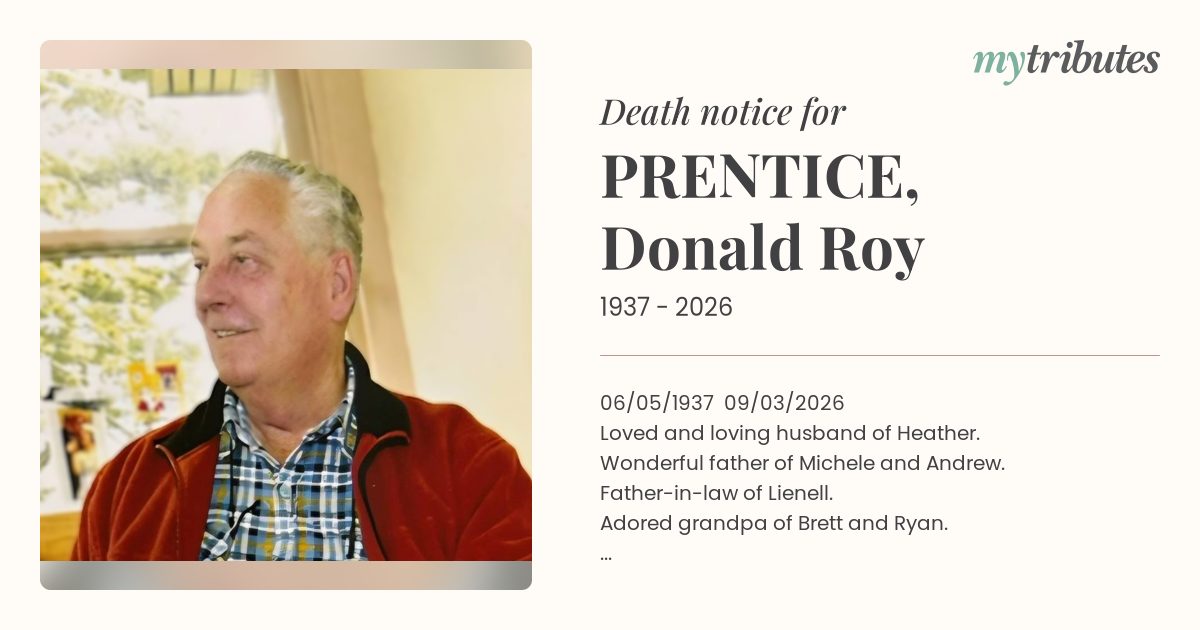 17°C06/05/1937 – 09/03/2026 Loved and loving husband of Heather. Wonderful father of Michele and Andrew. Father-in-law of Lienell. Adored grandpa of Brett and Ryan. Sadly missed. In God's Care.