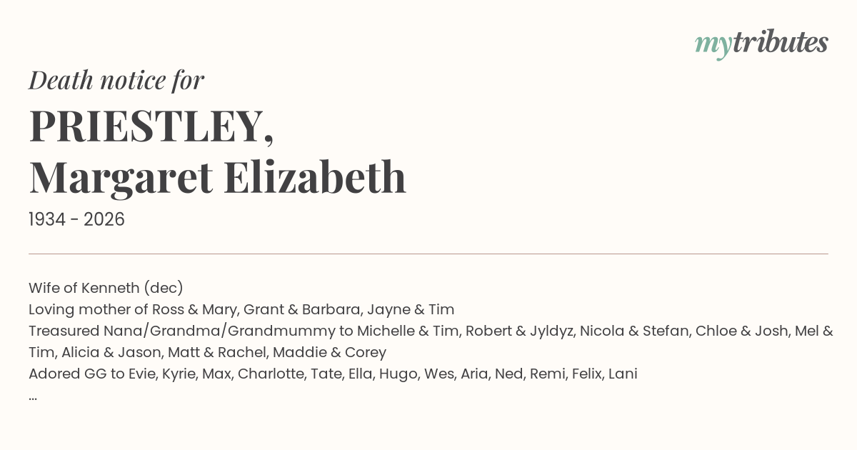 Loving mother of Ross & Mary, Grant & Barbara, Jayne & Tim