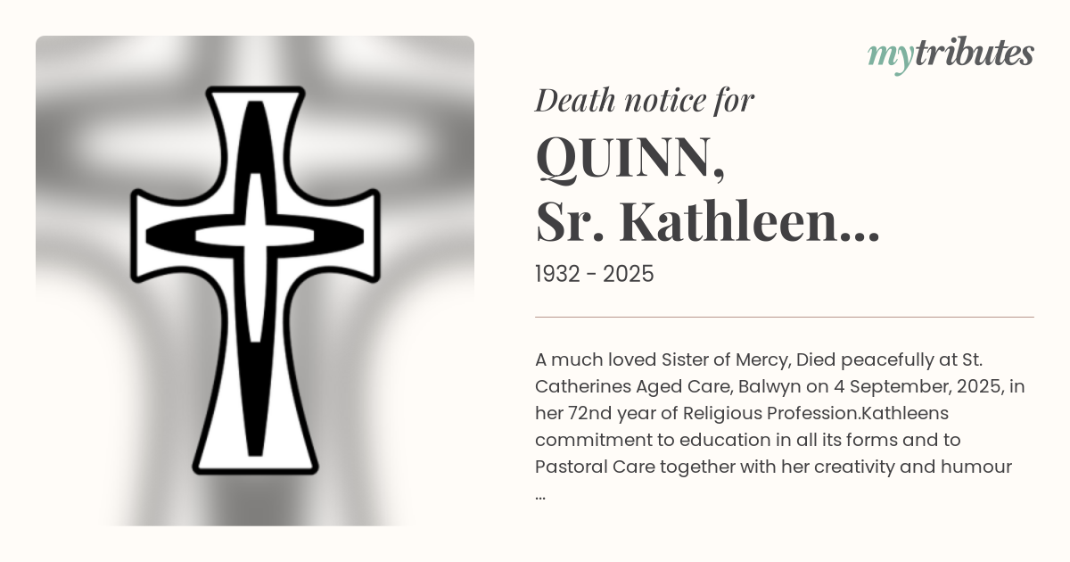17°CA much loved Sister of Mercy, Died peacefully at St. Catherine’s Aged Care, Balwyn on 4 September, 2025, in her 72nd year of Religious Profession.