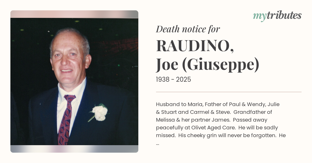 17°CHusband to Maria, Father of Paul & Wendy, Julie & Stuart and Carmel & Steve. Grandfather of Melissa & her partner James. Passed away peacefully at Olivet Aged Care. He will be sadly missed. His cheeky grin will never be forgotten. He is now at home with Jesus, at peace for eternity.