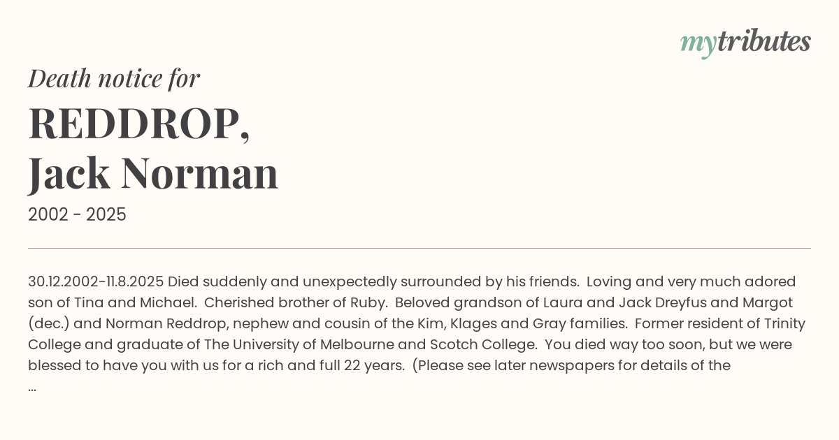 Loving and very much adored son of Tina and Michael. Cherished brother of Ruby. Beloved grandson of Laura and Jack Dreyfus and Margot (dec.) and Norman Reddrop, nephew and cousin of the Kim, Klages and Gray families. Former resident of Trinity College and graduate of The University of Melbourne and Scotch College.