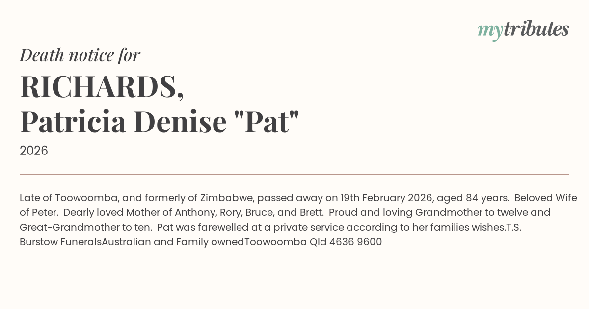 17°CLate of Toowoomba, and formerly of Zimbabwe, passed away on 19th February 2026, aged 84 years.