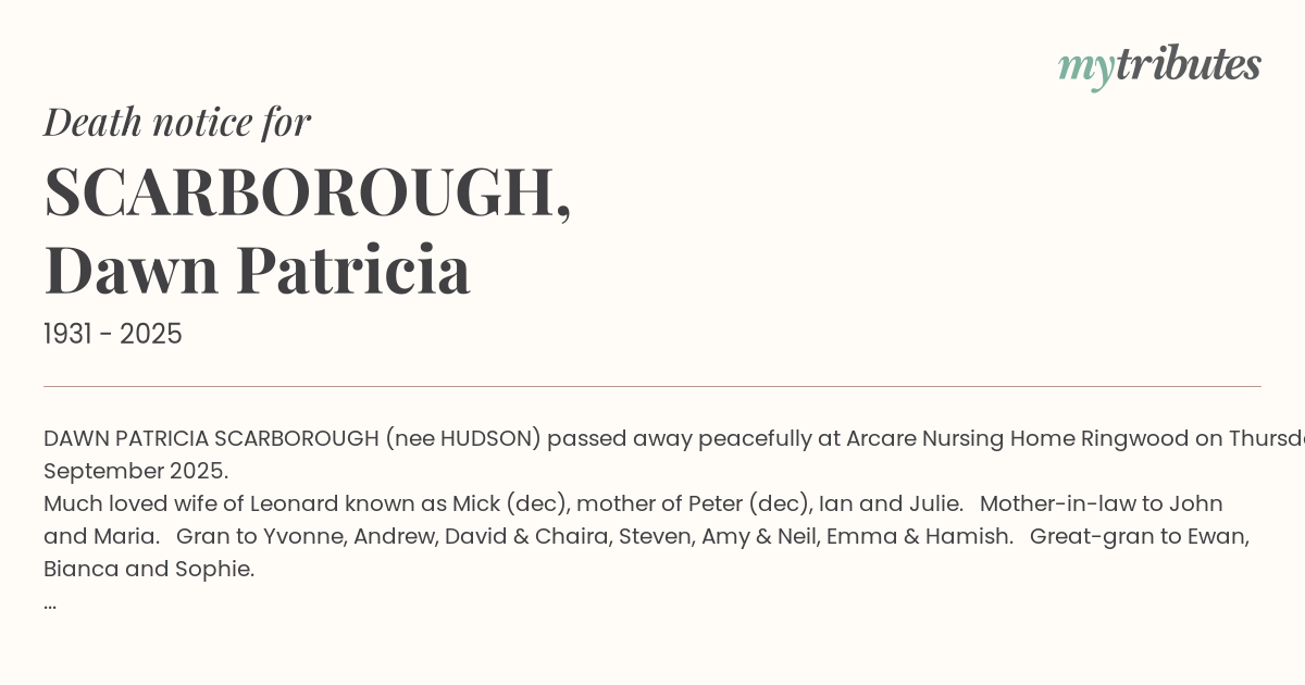 17°CDAWN PATRICIA SCARBOROUGH (nee HUDSON) passed away peacefully at Arcare Nursing Home Ringwood on Thursday, 18 September 2025.