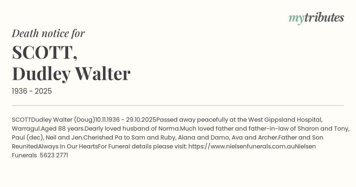For Funeral details please visit: https://www.nielsenfunerals.com.au