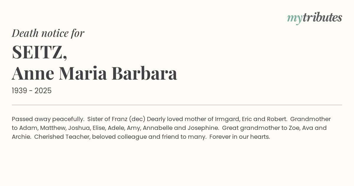 17°CPassed away peacefully. Sister of Franz (dec) Dearly loved mother of Irmgard, Eric and Robert. Grandmother to Adam, Matthew, Joshua, Elise, Adele, Amy, Annabelle and Josephine. Great grandmother to Zoe, Ava and Archie. Cherished Teacher, beloved colleague and friend to many. Forever in our hearts.