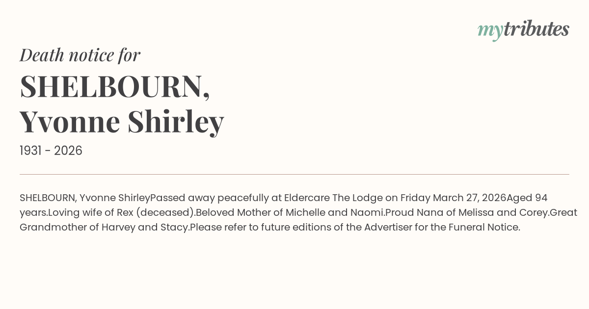 Passed away peacefully at Eldercare The Lodge on Friday March 27, 2026