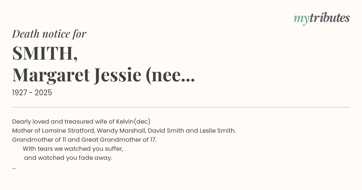 Mother of Lorraine Stratford, Wendy Marshall, David Smith and Leslie Smith.
