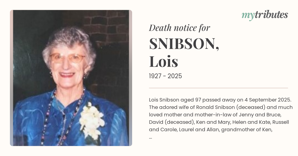 17°CLois Snibson aged 97 passed away on 4 September 2025. The adored wife of Ronald Snibson (deceased) and much loved mother and mother-in-law of Jenny and Bruce, David (deceased), Ken and Mary, Helen and Kate, Russell and Carole, Laurel and Allan, grandmother of Ken, Stephen, Stella, Tom, Natasha, Emily, Makeely, Aaron, Karina, Marnie, Max, Ted and Charlie and loved great grandma to 8 great grandchildren. Will be deeply missed by all who knew her. No flowers please.
