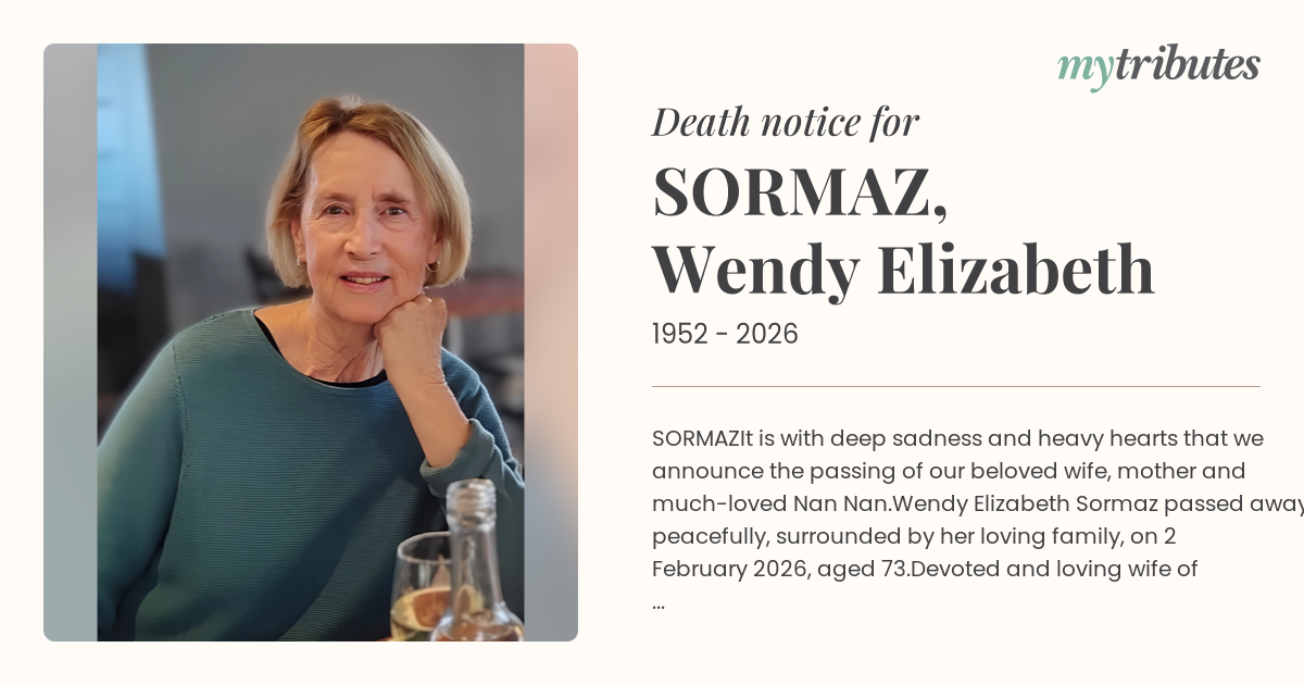 Wendy Elizabeth Sormaz passed away peacefully, surrounded by her loving family, on 2 February 2026, aged 73.