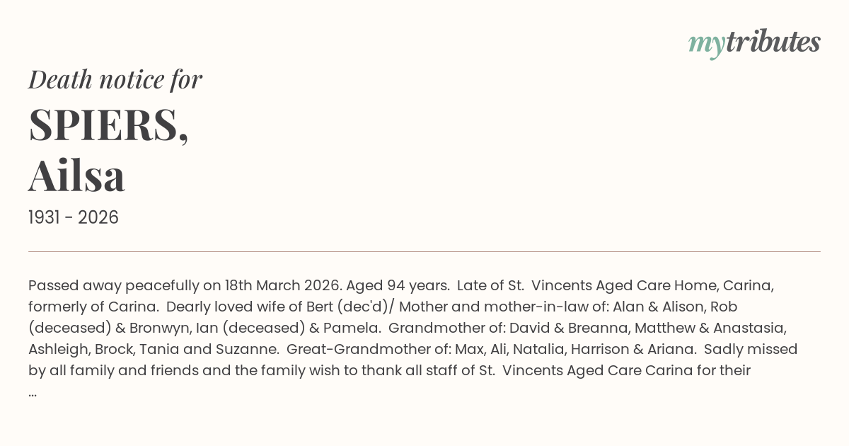 17°CPassed away peacefully on 18th March 2026. Aged 94 years. Late of St. Vincents Aged Care Home, Carina, formerly of Carina. Dearly loved wife of Bert (dec'd)/ Mother and mother-in-law of: Alan & Alison, Rob (deceased) & Bronwyn, Ian (deceased) & Pamela. Grandmother of: David & Breanna, Matthew & Anastasia, Ashleigh, Brock, Tania and Suzanne. Great-Grandmother of: Max, Ali, Natalia, Harrison & Ariana. Sadly missed by all family and friends and the family wish to thank all staff of St. Vincents Aged Care Carina for their care of Ailsa over the last nearly 11 years. Privately cremated as per Ailsa’s wishes