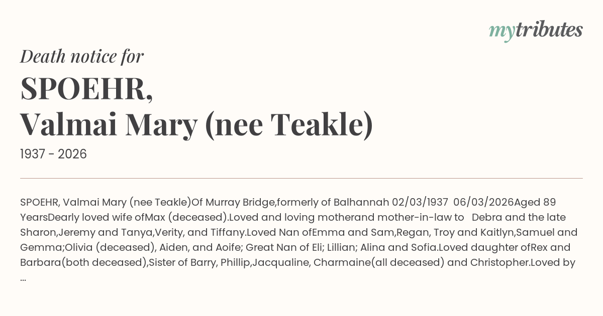 Valmai’s private funeral service was held on Tuesday, 17th March 2026.