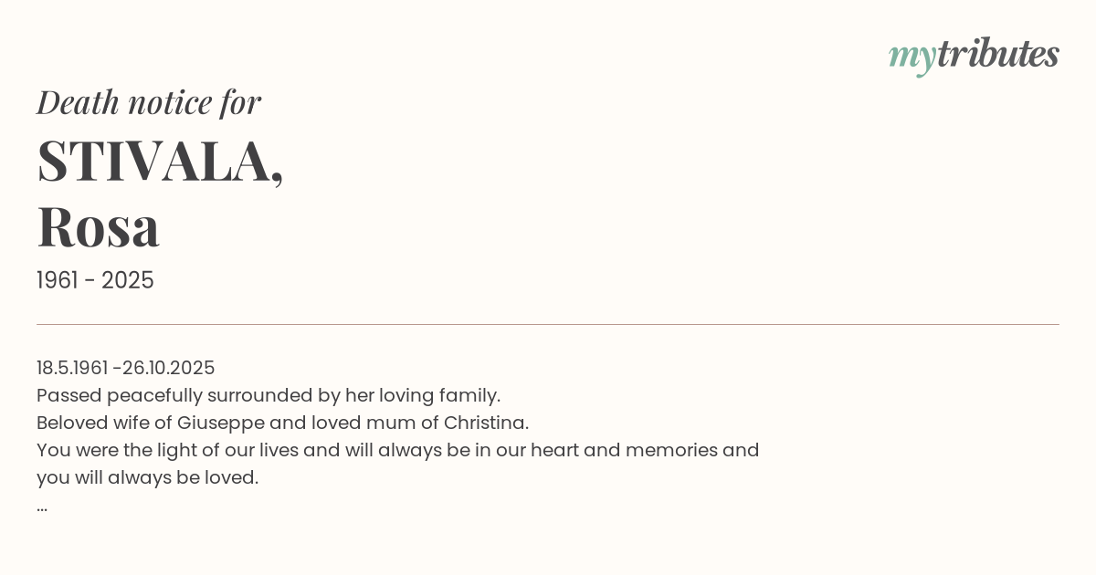 Beloved wife of Giuseppe and loved mum of Christina.