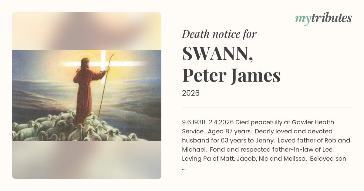 17°C9.6.1938 – 2.4.2026 Died peacefully at Gawler Health Service. Aged 87 years. Dearly loved and devoted husband for 63 years to Jenny. Loved father of Rob and Michael. Fond and respected father-in-law of Lee. Loving Pa of Matt, Jacob, Nic and Melissa. Beloved son of Bob and Irene (both dec). Dearly loved brother of John. Forever in our Hearts. Rest in Peace.