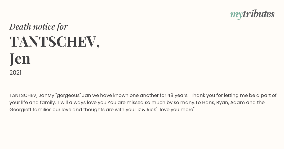My "gorgeous" Jan we have known one another for 48 years. Thank you for letting me be a part of your life and family. I will always love you.