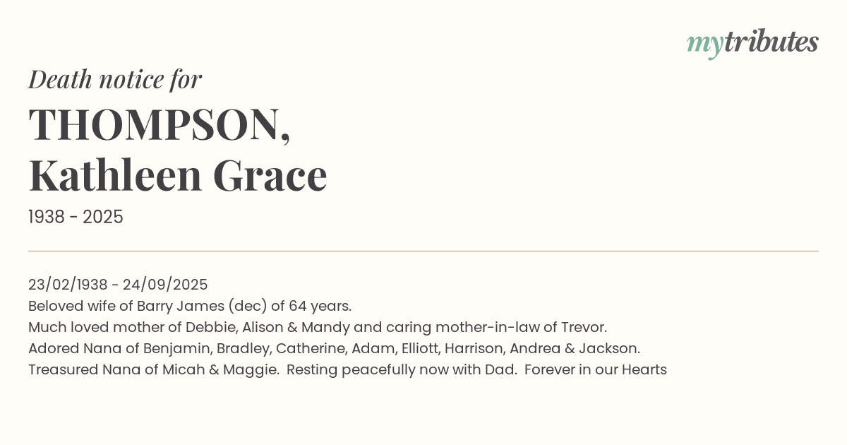17°C23/02/1938 - 24/09/2025 Beloved wife of Barry James (dec) of 64 years. Much loved mother of Debbie, Alison & Mandy and caring mother-in-law of Trevor. Adored Nana of Benjamin, Bradley, Catherine, Adam, Elliott, Harrison, Andrea & Jackson. Treasured Nana of Micah & Maggie. Resting peacefully now with Dad. Forever in our Hearts