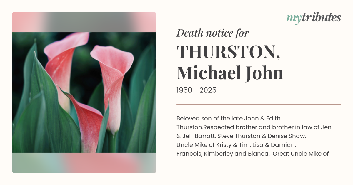 Respected brother and brother in law of Jen & Jeff Barratt, Steve Thurston & Denise Shaw. Uncle Mike of Kristy & Tim, Lisa & Damian, Francois, Kimberley and Bianca. Great Uncle Mike of Audrey and Oscar.