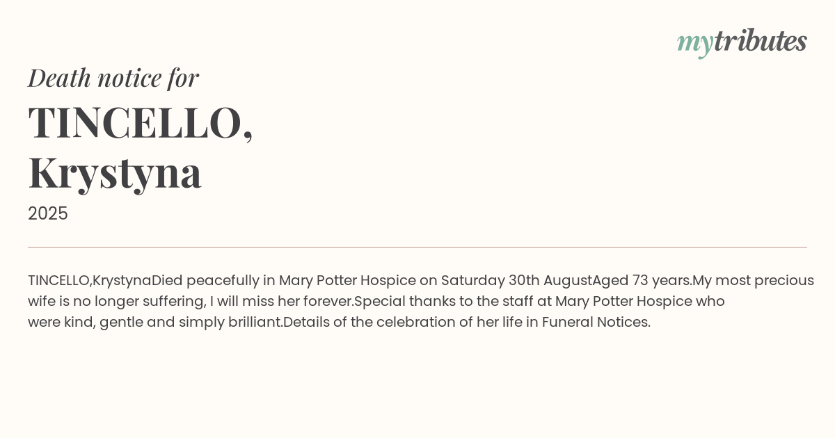 Died peacefully in Mary Potter Hospice on Saturday 30th August