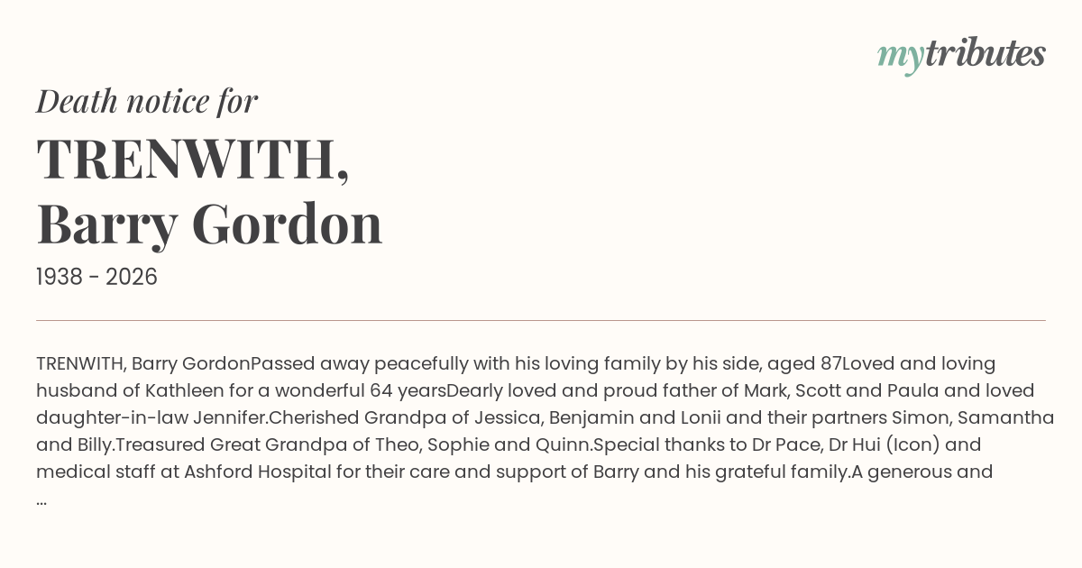 Cherished Grandpa of Jessica, Benjamin and Lonii and their partners Simon, Samantha and Billy.