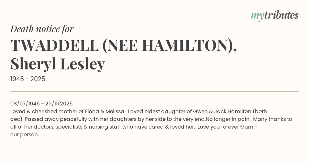 17°C08/07/1946 - 29/11/2025 Loved & cherished mother of Fiona & Melissa. Loved eldest daughter of Gwen & Jack Hamilton (both dec). Passed away peacefully with her daughters by her side to the very end.No longer in pain. Many thanks to all of her doctors, specialists & nursing staff who have cared & loved her. Love you forever Mum - our person.