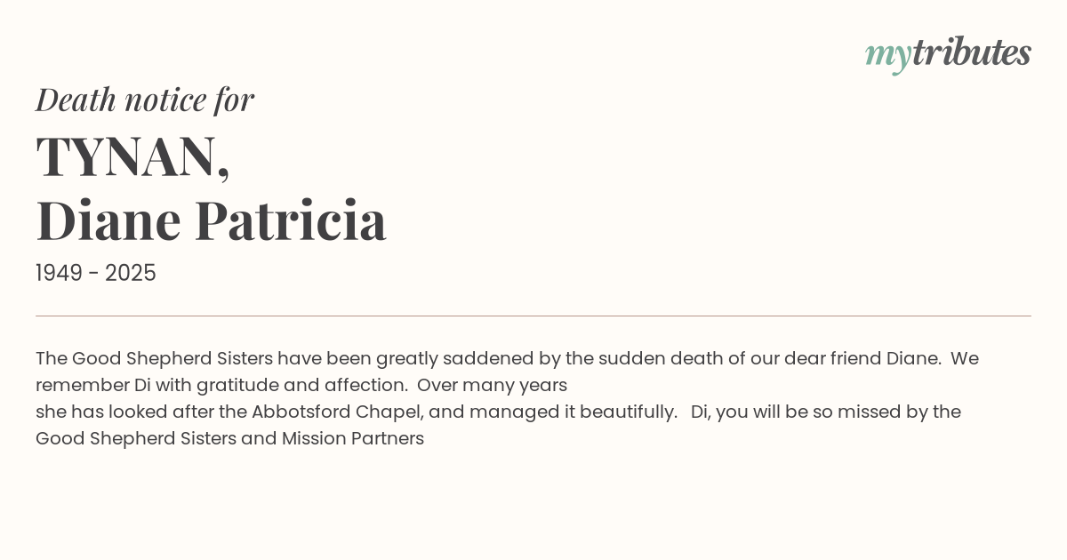 17°CThe Good Shepherd Sisters have been greatly saddened by the sudden death of our dear friend Diane. We remember Di with gratitude and affection. Over many years