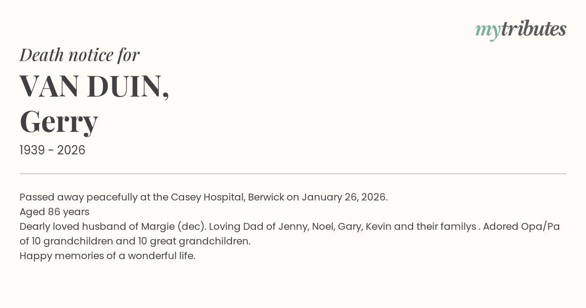 17°CPassed away peacefully at the Casey Hospital, Berwick on January 26, 2026.