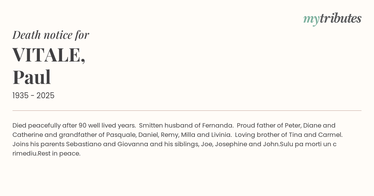 17°CDied peacefully after 90 well lived years. Smitten husband of Fernanda. Proud father of Peter, Diane and Catherine and grandfather of Pasquale, Daniel, Remy, Milla and Livinia. Loving brother of Tina and Carmel. Joins his parents Sebastiano and Giovanna and his siblings, Joe, Josephine and John.
