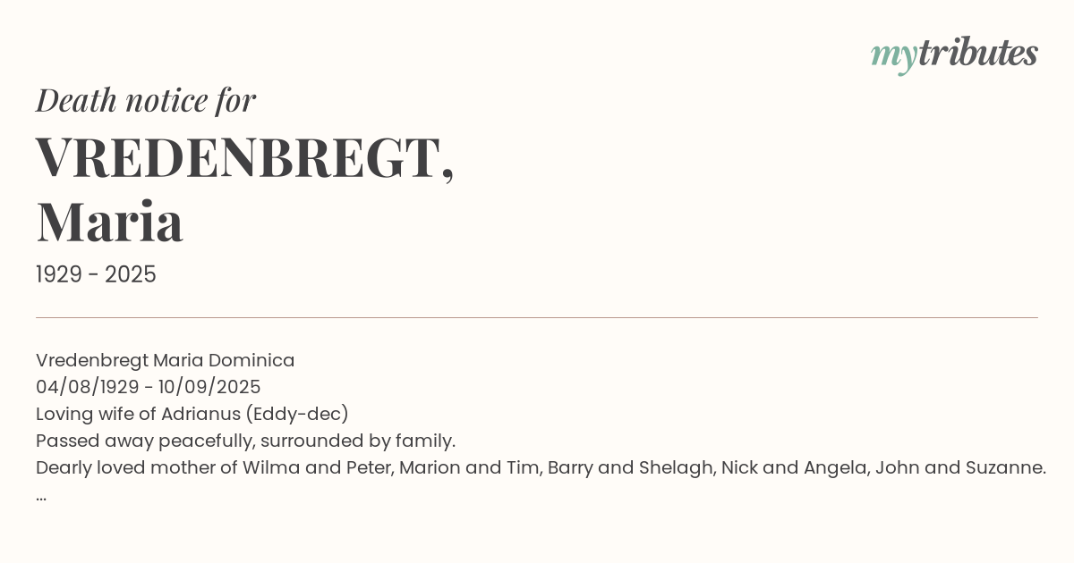 Dearly loved mother of Wilma and Peter, Marion and Tim, Barry and Shelagh, Nick and Angela, John and Suzanne.