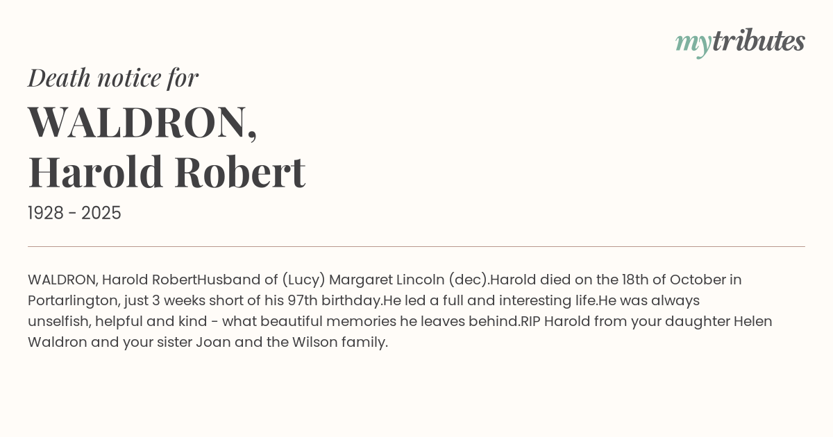 Harold died on the 18th of October in Portarlington, just 3 weeks short of his 97th birthday.